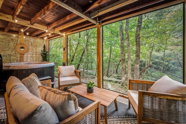 The A-frame was so beautiful and cozy! The kitchen seems small, but we made spectacular meals and cooked all but one meal in the cabin. Totally easy to navigate!Being on the river gave the perfect ambiance. We enjoyed morning coffee on the swing and enjoyed the sounds from the river, and the leaves falling all around. The sounds and views are so gorgeous and peaceful. We stuck our toes in the water like kids! We absolutely enjoyed the hot tub. Perfect with the cozy living space there as well. The robes provided were convenient and a nice touch! The bed on the lower level is SO COMFORTABLE! The mattress, pillows and comforter was like heaven and thats tough to find. In the evenings we enjoyed the indoor fireplace, games and outdoor grilling with most of our dinners and breakfasts on the main level deck. There is a tv with all of the popular things in the living area on the main floor and the lower master bedroom. We also thoroughly enjoyed the retro record player and albums. One of the best parts was napping listening to the rain hitting the roof. Communication with the hosts was fantastic, so we had no problems at all getting in or out.The drive to the A-frame was easy with no issues using Maps or Waze, and no steep inclines. We ventured out one day to explore and found the BEST meat market (Bittercreek), Logan Turnpike Grits, amazing quiche at BonBons, exquisite chocolates, an historic diner (Hole In The Wall), delicious smoothies, and super fun shopping. Book it!