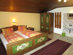 "Bloserhof", 4-room apartment 90 m2, on the top floor. Simple furnishings: 1 room with sloping ceilings with 1 double bed and hand-basin. Exit to the balcony. 1 room with sloping ceilings with 1 bed, 1 double bed and hand-basin. Exit to the balcony. 1 room with sloping ceilings with 1 bed, 1 double bed and hand-basin. Kitchen-/living room (oven, dishwasher, 4 ceramic glass hob hotplates, toaster, kettle, microwave, electric coffee machine) with dining table, satellite TV and radio. Shower, sep. WC. Small balcony 10 m2. Balcony furniture, deck chairs (2). Marvellous panoramic view of the mountains and the valley. Facilities: children's high chair, baby cot. Internet (WiFi, free). Please note: non-smokers only. Fire extinguisher. When there are less than the maximum number of guests staying at the property, not all of the bedrooms will be available for use.